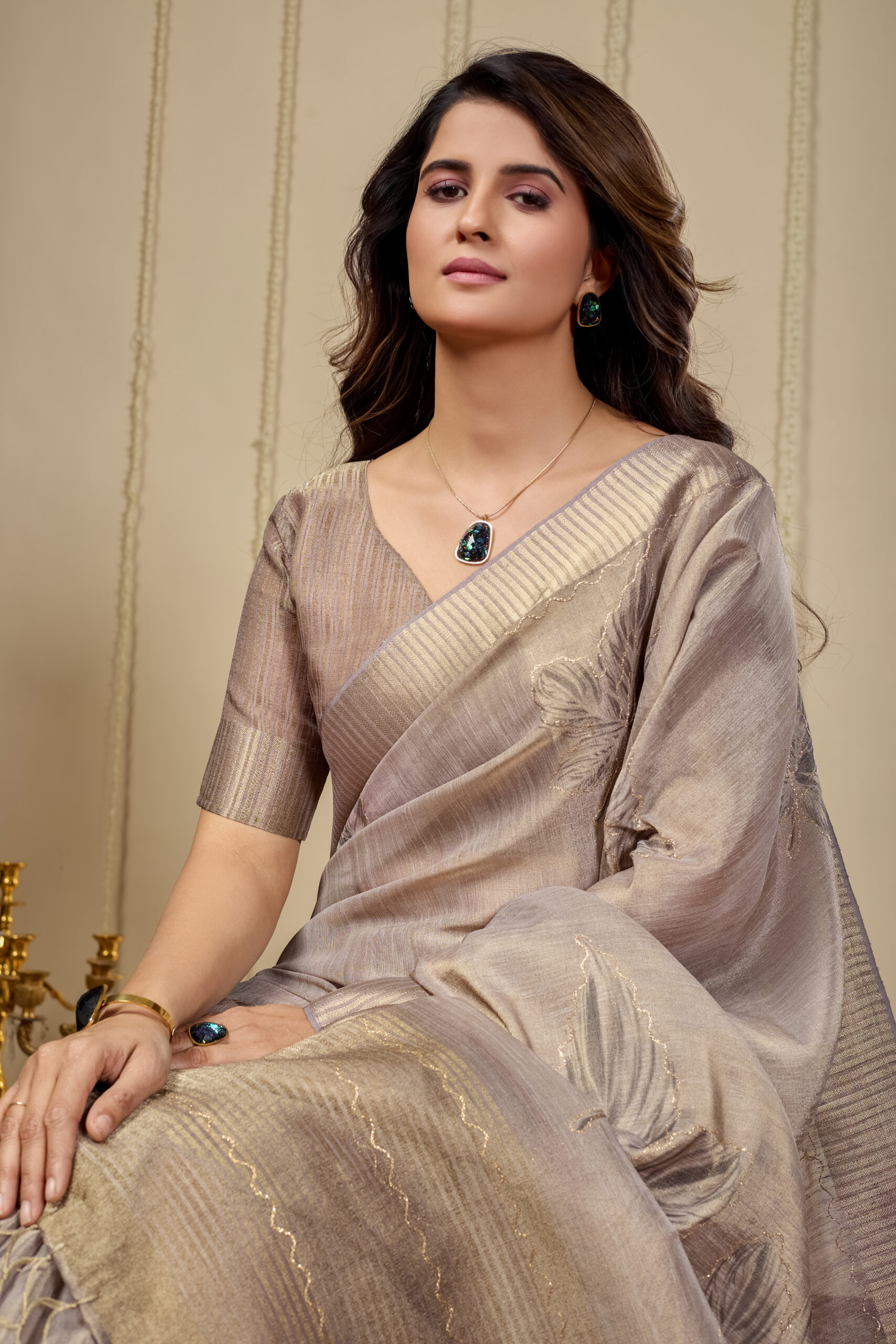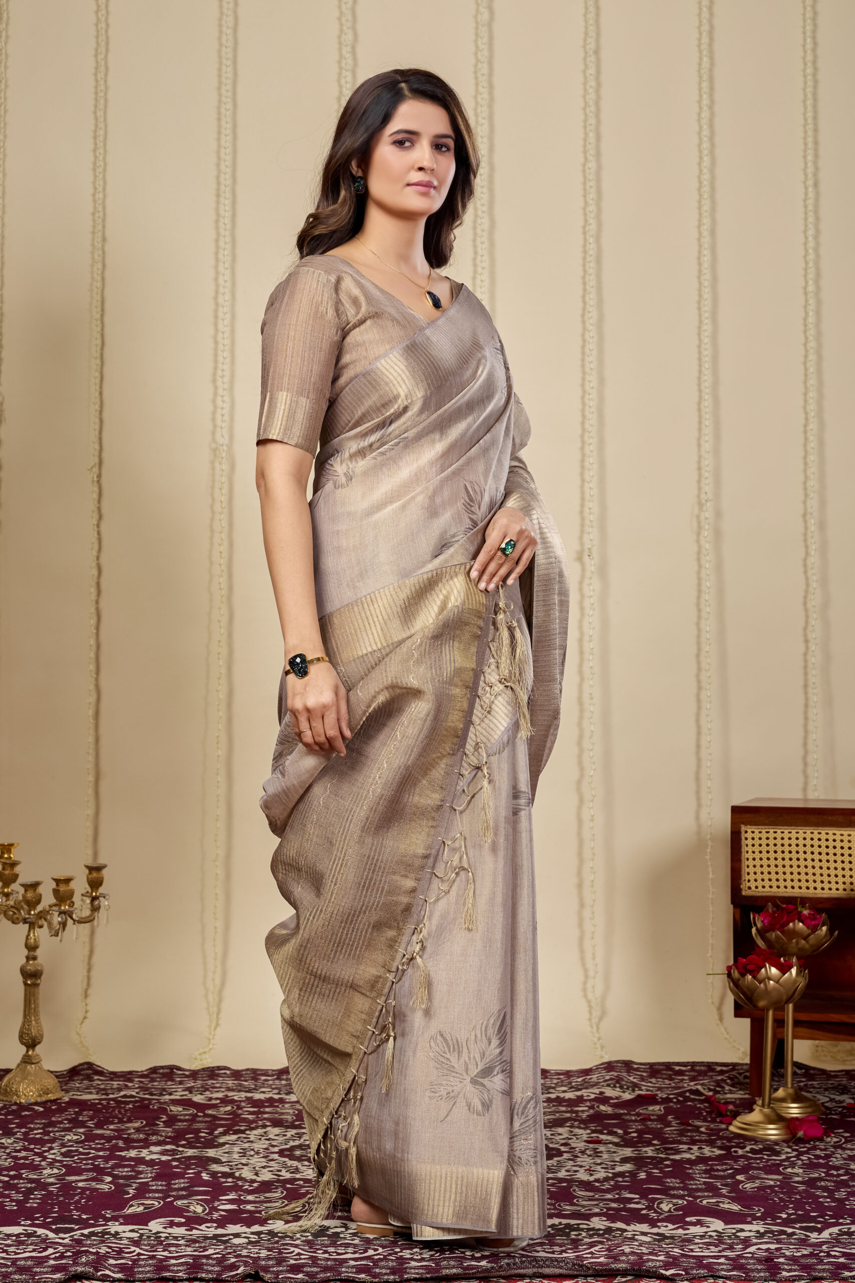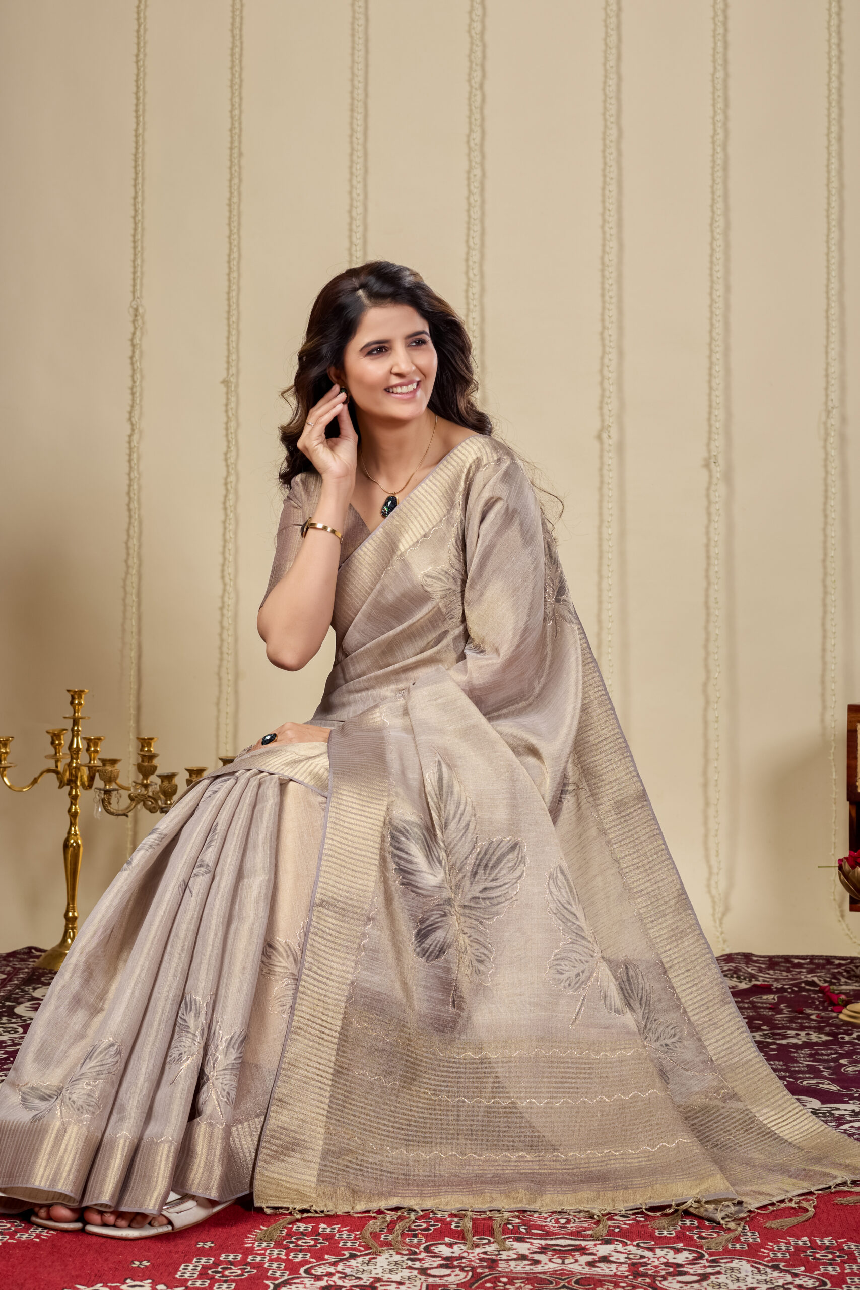 Elevate your ethnic wardrobe with this elegant linen tissue saree, designed for effortless sophistication. Crafted in a soft beige tone, the saree features delicate digital prints complemented by an intricately detailed chit pallu. Subtle aari work adds a refined artisanal touch, making it a perfect blend of tradition and contemporary elegance. Lightweight, graceful, and timeless—ideal for refined celebrations and formal gatherings.